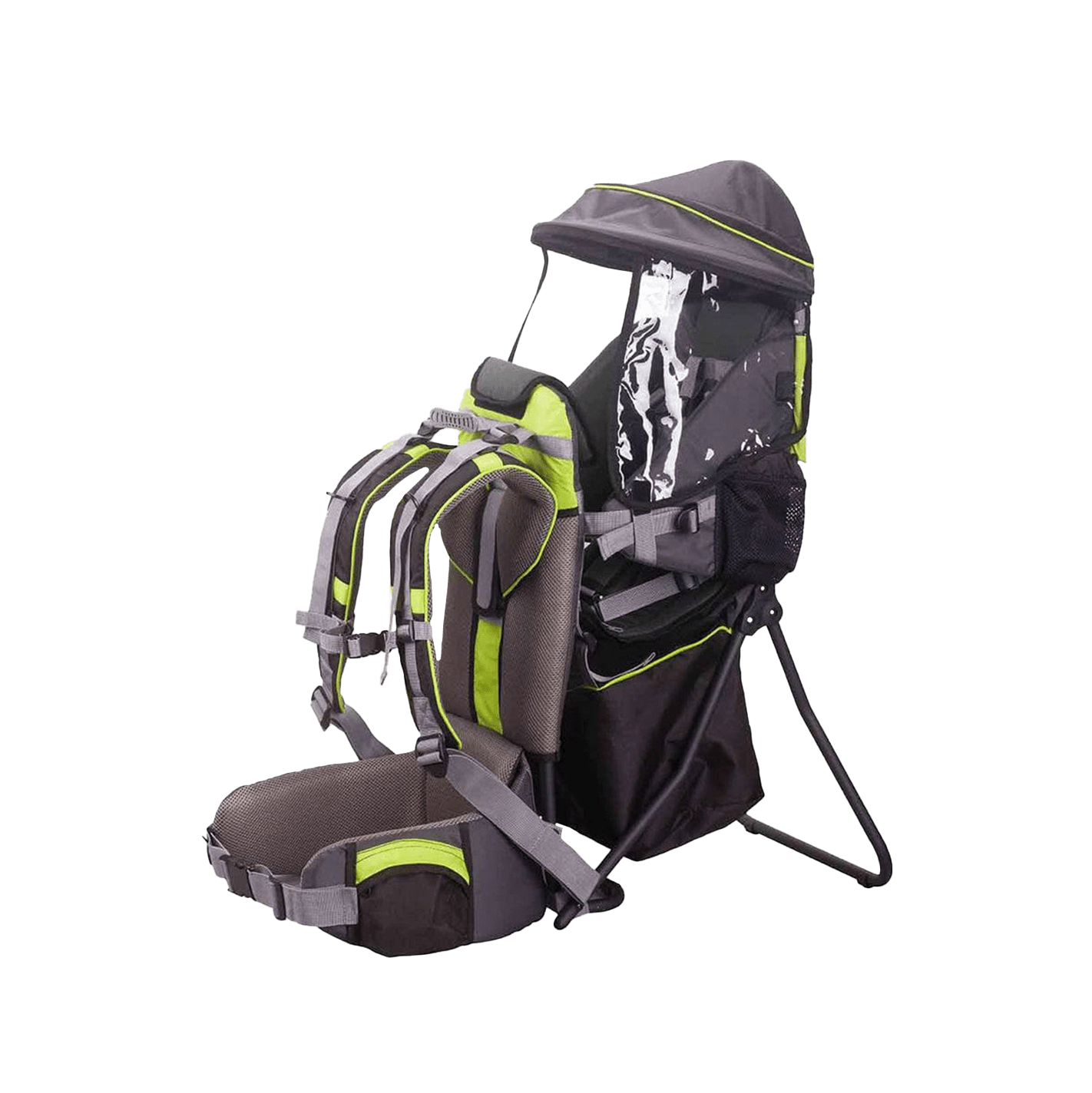 This child backpack carrier is built with a strong, lightweight metal frame and durable oxford fabric—perfect for daily adventures. It features padded straps, multiple pockets, a large diaper compartment with reflective strip, and a removable sun/rain canopy. Adjustable for comfort and folds flat for easy storage.